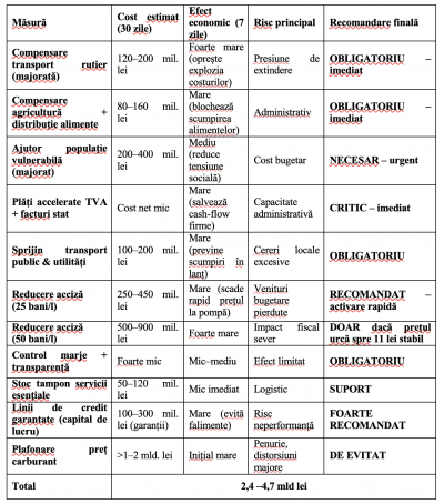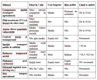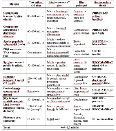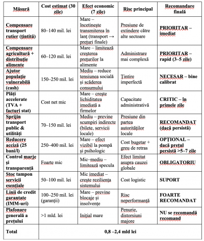 În acest context, recomandarea de fond este să nu se realizeze o plafonare generală a prețului la pompă, ci protecție țintită + lichiditate pentru sectoarele expuse + reducerea dependenței de motorină.