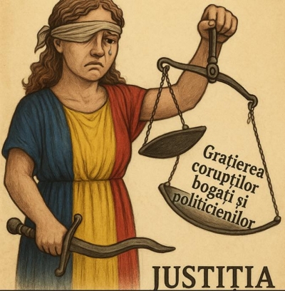 Cam așa este imaginea distorsionată a zeiței romane Iustitia cu trei atribute distorsionate: balanță (care ar trebui să simbolizeze obiectivismul și echitatea) care inclina către cei corupți / sabia (simbol al autorității și puterii coercitive) care este strâmbă / eșarfă (imparțialitatea – Justiția trebuie să fie oarbă la avere, statut social, putere sau identitatea persoanelor) – care este ridicată și ochiul care plânge. Eu așa am imaginea în minte, ilustrată cu ajutorul ChatGPT. Ce crezi, reflectă realitatea?