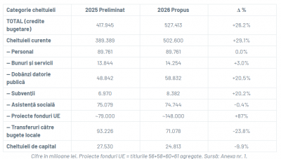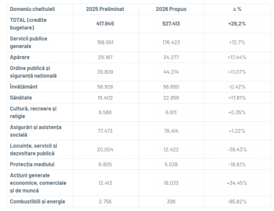 - Alte cheltuieli: buget cu 3,12% mai mic în 2026;