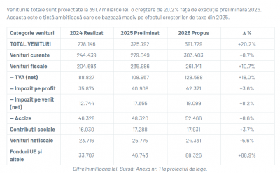 Veniturile totale sunt proiectate la 391,7 miliarde lei, o creștere de 20,2% față de execuția preliminară 2025. Aceasta este o țintă ambițioasă care se bazează masiv pe efectul creșterilor de taxe din 2025.
