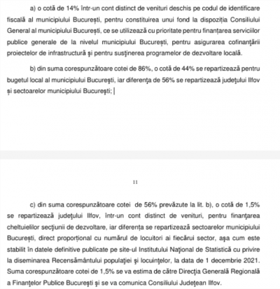 Mai mult, din această cotă de 56% destinată sectoarelor, o parte – respectiv 1,5% – este transferată către județul Ilfov pentru finanțarea cheltuielilor de dezvoltare, iar diferența se repartizează sectoarelor Capitalei direct proporțional cu numărul de locuitori. În practică, această formulă menține fragmentarea veniturilor provenite din impozitul pe venit și limitează capacitatea Primăriei Generale de a decide asupra uneia dintre principalele surse de finanțare ale orașului.