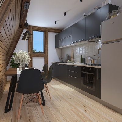 Lemnul rămâne baza oricărui design de cabană, dar secretul stă în modul în care îl folosești. În loc să te oprești la podea, îndrăznește să îmbraci un perete întreg în lambriuri sau panouri din parchet de lemn masiv. E un gest curajos, dar care schimbă complet atmosfera. Vei obține o senzație de căldură, intimitate și conexiune cu natura- exact ceea ce ne lipsește adesea în locuințele urbane. Într-un astfel de cadru, orice piesă de mobilier modernă- de la o bucătărie elegantă până la o canapea minimalistă- se așază firesc și echilibrat. Lemnul nu e doar un material, ci o stare.