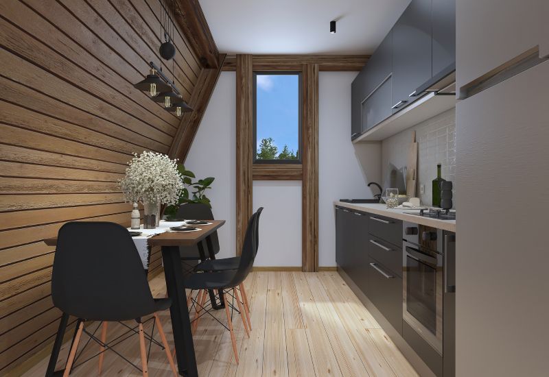 Pentru ca o cabană să arate modern, e nevoie de contrast. Dacă te limitezi doar la tonuri naturale, riști un decor monoton. În schimb, încearcă să asociezi materiale și finisaje opuse: o bucătărie cu fronturi gri mat alături de un perete din lemn creează o combinație sofisticată, iar reflexele metalice se joacă frumos cu textura organică. Contrastul dintre rece (metal, piatră, faianță de bucătărie) și cald (lemn, lumină difuză) aduce dinamism și prospețime. Asta face diferența între un spațiu banal și unul cu personalitate. Iar dacă mai adaugi accente negre sau o pată de culoare intensă, vei avea o cabană care respiră design contemporan, nu nostalgia anilor ‘80.