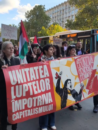 În imagine nu e un mesaj întâmplător, adus de o protestatară. E un banner pregătit din timp, pe care scrie: “Unitatea luptelor împotriva capitalismului”, alături, alte pancarte cu mesaje precum “Femicidul e simptomul, capitalismul e cauza”, iar printre ele, steaguri ale Palestinei.