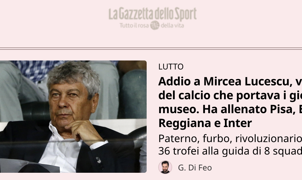 Gazzetta dello Sport, unul dintre cele mai cunoscute ziare de sport din lume, dedică un editorial emoționant memoriei lui Mircea Lucescu, care a antrenat nu mai puțin de 4 echipe în Italia: Pisa, Brescia, Reggiana și Inter Milano.