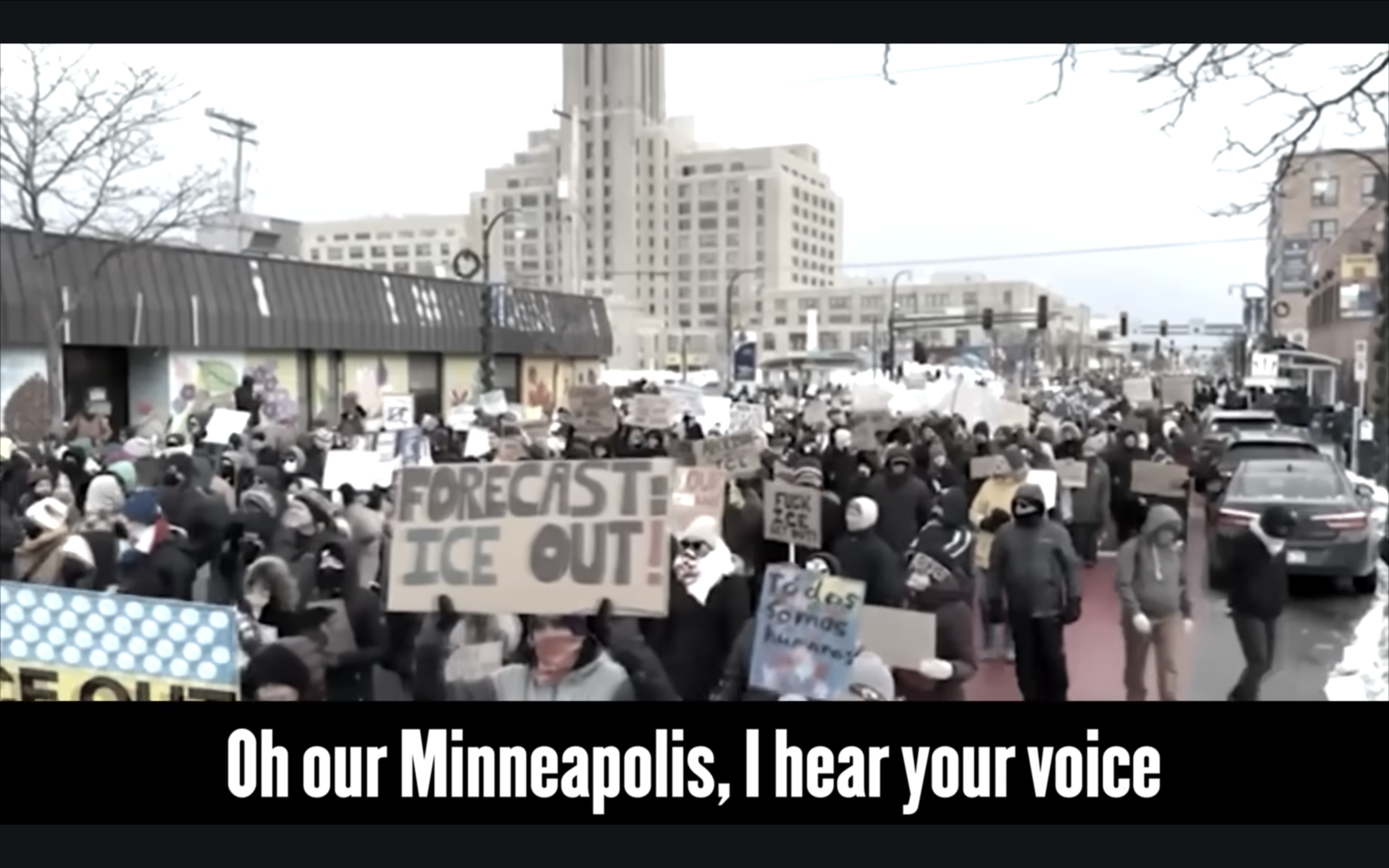 Refrenul piesei este următorul: „Minneapolis, îți aud vocea / Cântând prin ceața însângerată / Vom lua poziție pentru acest pământ / Și pentru străinul din mijlocul nostru / Aici, în casa noastră, au ucis / În iarna anului 2026 / Ne vom aminti numele celor care au murit / Pe străzile din Minneapolis”.