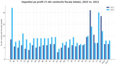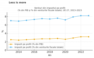 Contraintuitiv, între 2013 și 2023, impozitul pe profit (în termeni absoluți) a crescut ca pondere atât în veniturile fiscale totale (ajungând la 8,2% în 2023), cât și în PIB (3,2% în 2023), arată același raport TAXUD.