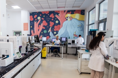 Aici am ajuns – în inima analizelor medicale din București. Un spațiu de 3000 de metri pătrați, în care Regina Maria și-a relocat Laboratorul Central. Un spațiu care s-a transformat într-o uriașă pânză pentru artistul grafic Saddo, căruia i s-a dat mână liberă pentru a ilustra asemănarea dintre lumea celulară, microscopică și design. Așa că pereții celor două niveluri ale laboratorului central sunt departe de sobrietatea și răceala specifică unui spațiu medical.