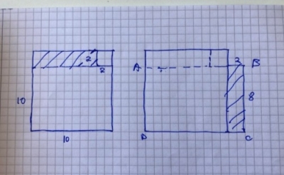 Din considerente de simplitate și simetrie, adică de „mathematical beauty”, în sensul lui Dirac, ar fi bine ca soluția să fie 10 și 10. Dar 10x10=100, nu 96. Prin urmare, decupăm din pătratul de arie 100, pătrățelul de arie 100-96=4 și latură 2. Luăm aria hașurată și o așezăm în continuarea ariei rămase; se obține dreptunghiul ABCD, cu laturile 12 și 8, și arie 96. Deci, soluția este 12; 8.