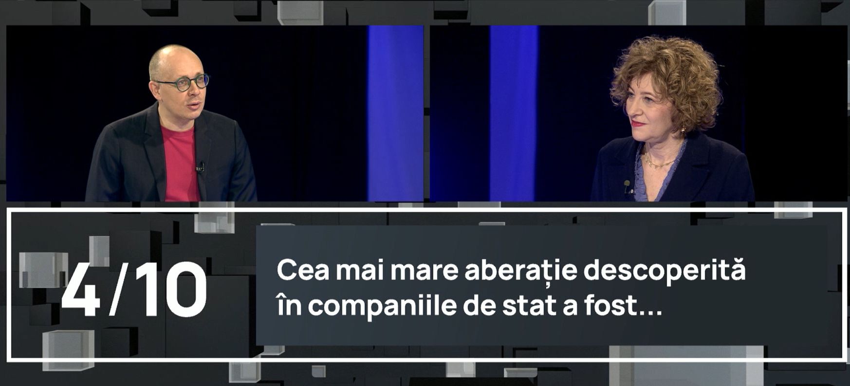 Întrebată, în finalul emisiunii, care a fost cea mai mare aberație pe care a descoperit-o în companiile de stat, vicepremierul a răspuns: „M-au șocat pierderile foarte mari, care depășeau 1,4 - 1,5 miliarde de lei la unele companii de stat”.
