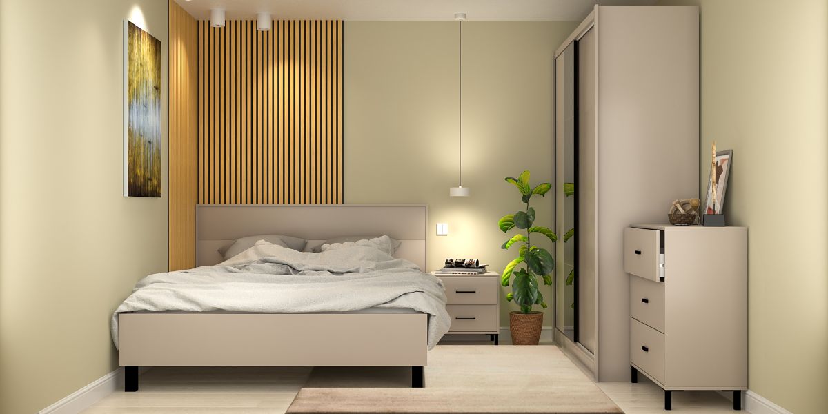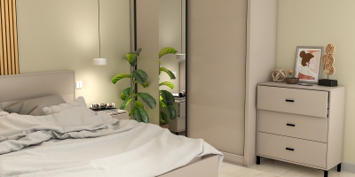 Piesa centrală este patul matrimonial, iar alegerea lui trebuie făcută fără compromisuri. Modelul Salona, bej cashmere, 160 x 200 cm oferă exact acel echilibru între confort și stabilitate vizuală. Lângă el, noptiera Vienne No2F, cu 2 sertare păstrează linia curată și funcțională, iar comoda Salona, cu 3 sertare completează ansamblul fără excese decorative. Pentru depozitare eficientă și coerență materială, dulapul Albi, 180 cm, cu uși glisante și oglindă integrează funcționalitatea într-un volum unitar, care păstrează senzația de ordine.