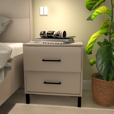 Zona de relaxare, foarte importantă în acest tip de încăperi, este completată de un covor Chip, crem, 160 x 230 cm, care adaugă confort tactil și delimitează subtil patul. Detaliile de finisaj, cum este plinta din polimer dur, alb, închid elegant linia pardoselii și oferă un aspect curat, bine definit.