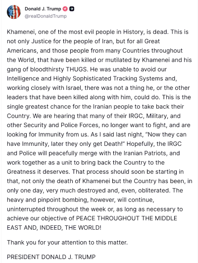 Ulterior, informația morții liderului suprem al Iranului a fost confirmată de presa de stat iraniană, care notează că Ali Khamenei a fost ucis în biroul său, în primele ore ale zilei de sâmbătă, în timp ce „își îndeplinea îndatoririle”. Presa de stat iraniană a anunțat, de asemenea, că fiica, ginerele și nepotul ayatollahului au fost uciși într-un atac. La rândul său, Garda Revoluționară iraniană deplânge moartea liderului său și anunță că „mâna răzbunării națiunii iraniene nu îi va lăsa să scape”.