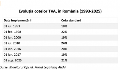 Cu mențiunea că situația finanțelor publice din 2010 era considerabil mai dificilă decât cea actuală, experiența acelui moment arată că majorarea TVA rămâne, în mod tradițional, prima opțiune atunci când statul are nevoie rapidă de resurse suplimentare.