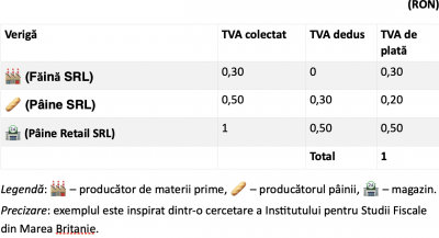 - La rândul său, Pâine SRL vinde pâinea către magazinul fabricii – să-i spunem Pâine Retail SRL – cu 5 lei plus TVA de 50 de bani. Pâine SRL va datora deci statului doar diferența dintre TVA-ul colectat (50 de bani) și cel dedus (30 de bani), adică 20 de bani, pentru că prima verigă din lanț (producătorul de făină) a colectat și achitat deja 30 de bani către stat. Totodată, acești 20 de bani datorați de Pâine SRL reprezintă cota TVA – 10%, în exemplul nostru – aplicată doar pe valoarea adăugată de producătorul pâinii în lanțul de aprovizionare.