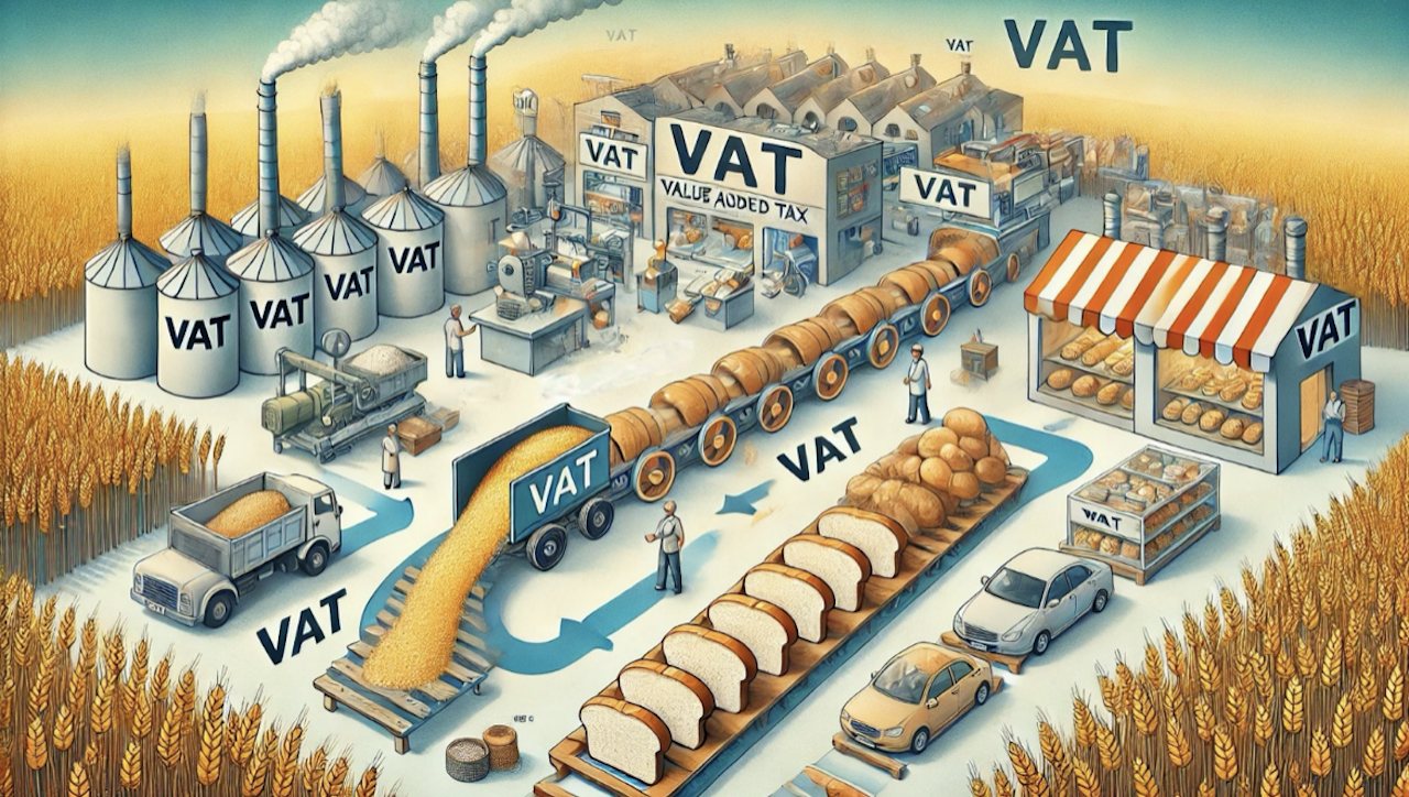 Pentru a înțelege mai clar cum funcționează mecanismul, să urmărim traseul unei pâini, de când iese din fabrică până ajunge pe masa consumatorului final. În exemplul de mai jos, pentru simplificare, vom considera o cotă redusă de 10%.