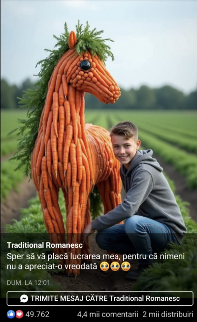 Scriam în 2023, cu exemple concrete, despre pagini probabil false, cu origini incerte, ce adunau zeci de mii de like-uri la o imagine cu un copil alături de un cal construit din morcovi și „nimeni nu-i apreciază munca”.