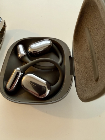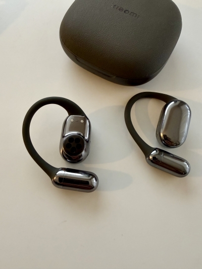 Ergonomie și confort: Căștile se așază pe ureche ca un clip, având un cârlig subțire care le înconjoară și un mic difuzor care stă pe tragus (partea din față a canalului urechii). Designul cu susținere în trei puncte chiar își face treaba – odată puse, căștile stau ferm, nu alunecă nici la mișcări bruște. Am dat din cap, m-am aplecat, am mers pe jos rapid – nu au căzut și aproape că uitam că le port. Sunt foarte ușoare (doar câteva grame fiecare) și materialul siliconic care atinge pielea este moale și plăcut. Un test important: le-am purtat și ~3 ore legat, inclusiv cu ochelari pe nas. De multe ori, căștile de tip peste ureche mă deranjează din cauza ramelor ochelarilor – aici, Xiaomi a gândit un profil subțire ce nu incomodează purtătorii de ochelari (brățara căștii trece pe după ureche fără să apese peste brațul ochelarilor). După aceste ore, urechile mele nu erau iritate și nu am simțit puncte de presiune supărătoare. Este un mare avantaj față de earbuds in-ear, care, oricât de ergonomice, tot încep să jeneze canalul urechii după mult timp. Aici, pavilionul urechii rămâne liber, ventilat – confortul e maxim chiar și la purtare îndelungată. Xiaomi subliniază că designul e aproape imperceptibil și tind să fiu de acord; a trebuit totuși să le dau jos când m-am așezat pe canapea, că ațipisem cu ele – atâta confort încât uiți de ele, dar mai bine nu dormi cu ele totuși ca să nu le scapi.