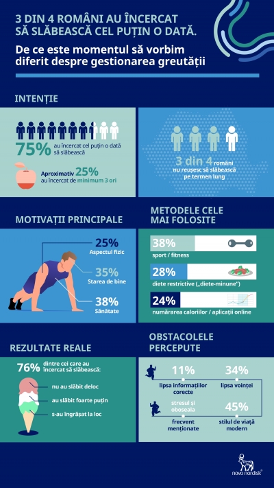 La fiecare început de an, slăbitul urcă direct în topul rezoluțiilor personale - promisiunea repetată că „anul acesta chiar reușesc”. Realitatea arată însă cât de dificil este drumul dintre intenție și rezultat durabil. Un nou sondaj realizat la nivel național, la inițiativa Novo Nordisk, pe un eșantion reprezentativ de 1.000 de persoane, arată că aproape 75% dintre respondenți au încercat cel puțin o dată să slăbească, iar 23% dintre aceștia au trecut prin minimum trei astfel de încercări de-a lungul timpului. Cu alte cuvinte, pentru milioane de oameni, slăbitul nu este o decizie de moment, ci o luptă reluată iar și iar.
