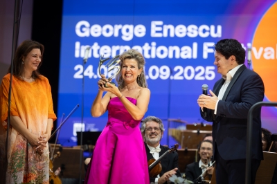 A cincea oară nu mai e singură, e însoţită de Cristina Uruc şi Cristian Măcelaru. Violonista primește primul Premiu de Excelență al Festivalului Enescu, instituit în chiar ediţia 2025, în semn de recunoaştere a celor 50 de ani de carieră muzicală. Discursul doamnei Mutter, într-o engleză cu tuşe de accent german emoţionează dintr-o dată, suntem din nou în catedrala lui Bach, pentru că e despre Lipatti, legătura cu Dumnezeu, Jesus bleibe meine Freude și George Enescu. Mă emoționez și mai tare când Anne-Sophie, care pare și mai fragilă fără vioară, spune că e mândra de țara noastră și de festival. Îi spune pe nume dirijorului, - „Cristian, te felicit, felicit festivalul minunat din ţara ta!” - moment în care realizezi că una dintre cele mai mari violoniste din istorie elogiază România. Da, Festivalul Enescu e un fenomen global. Cristian Măcelaru preia microfonul şi aflăm stupefiaţi că doamna Mutter nu e doar genial violonistă pe care şi eu am ascultat-o în adolescență până la saturaţie în Carmen Fantasy cu Wiener Philarmoniker, ci şi o inimă mare care a îngrijit două orfelinate de fete din România încă din 1998. Aşa se face caritate, în tăcere. Nimeni n-a ştiut nimic despre orfanele de la Victoria şi Orlat sau concertele ei de caritate cu Crucea Roşie germană. E o celebrare, una emoţionantă, în care frumuseţea umanităţii radiază din chipurile oamenilor care ne aduc de obicei frumuseţea prin sunete.