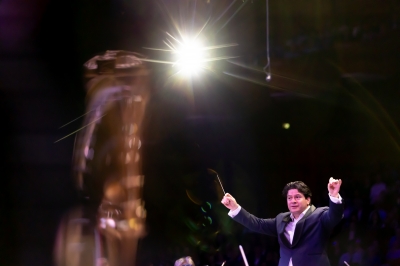 „Air"-ul lui Adès a fost scrisă în pandemie pentru Anne-Sophie Mutter, după lungi conversaţii telefonice între cei doi. E despre pierdere şi sufocare, despre lipsa de aer şi aerul ca îmbrăţişare a vieţii, ca o poţiune magică oferită de inima verde a planetei, un miracol pe care îl respirăm cu nesaţ dar nu ştim să îl păstrăm. Un cântec de recunoştinţă care pluteşte vreme de 20 de minute în înălţimile stratoferice ale registrului înalt al viorii. Violonista se decupează perfect în semicercul rochiilor şi fracurilor din orchestră, într-o rochie cyclamen care filigranează o siluetă delicată. E oţel în prizele digitaţiilor şi forţă inumană în arcuş, dar rezultatul e plutire în passacaglia dintr-un singur arc. Un zbor. Cristian Măcelaru dirijează pe vârfuri, până şi dezlănţuirile volumetrice sunt punctate din vârf de bagheta. Aplauzele irump şchiop, timid.