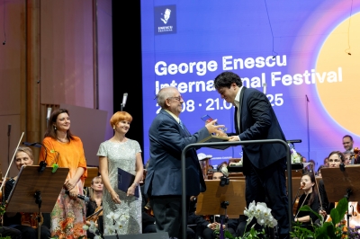 După pauză, celebrarea continuă. Alături de Remy Franck, președintele juriului ICMA și redactorul șef al respectatei publicații luxemburgheze Pizzicato, Remy Franck, președintele juriului ICMA și redactorul șef al respectatei publicații luxemburgheze Pizzicato îi înmânează lui Cristian Măcelaru Premiul International Classical Music Awards (ICMA) la secţiunea Muzică simfonică pentru albumul George Enescu (Simfoniile şi Rapsodiile) înregistrat de Orchestre National de France și Cristian Măcelaru la Deutsche Grammophon. Atât discursul directoarei Radio România Muzical cât şi laudatio citit de Remy Franck sunt calde şi naturale, fără solemnităţi festiviste. Cristian Măcelaru e emoţionat ca un şcolar care primeşte coroniţa în faţa întregii familii. Dar Daphnis și Chloé îl fac să uite imediat de emoţii. În a doua parte a concertului, Orchestra Națională a Franței ne regalează cu frescele viselor lui Ravel despre Grecia antică. Corzile sunt scânteietoare în Dansul sacru, şi plutitoare în lumina noctuernei eline. Corul Filarmonicii George Enescu e dinamic și vaporos iar verva coregrafică a lui Măcelaru duce orchestra la incadenscență în Dansul războinic, stratificat genial de dirijor până la o apogeul unei dezlănțuiri ritmice. E un potop sonor, unul stăpânit de mâna fermă și zâmbetul fericit al lui Cristian Măcelaru. Completarea multimedia semnată de Nona Ciobanu şi Peter Košir, o creaţie fără utilizarea AI nu e atât de disturbatoare. Poate şi din cauza materialului coregrafic al lui Gigi Căciuleanu şi participarea actorilor Ana şi Bogdan Iacob. Adès, Mozart, Ravel cu francezii românului Cristian Măcelaru a fost una dintre cel mai frumoase seri din Festivalul Enescu 2025. Seara frumuseţii în celebrare. Mulţumesc, Anne-Sophie Mutter. Mulţumesc, National de France!